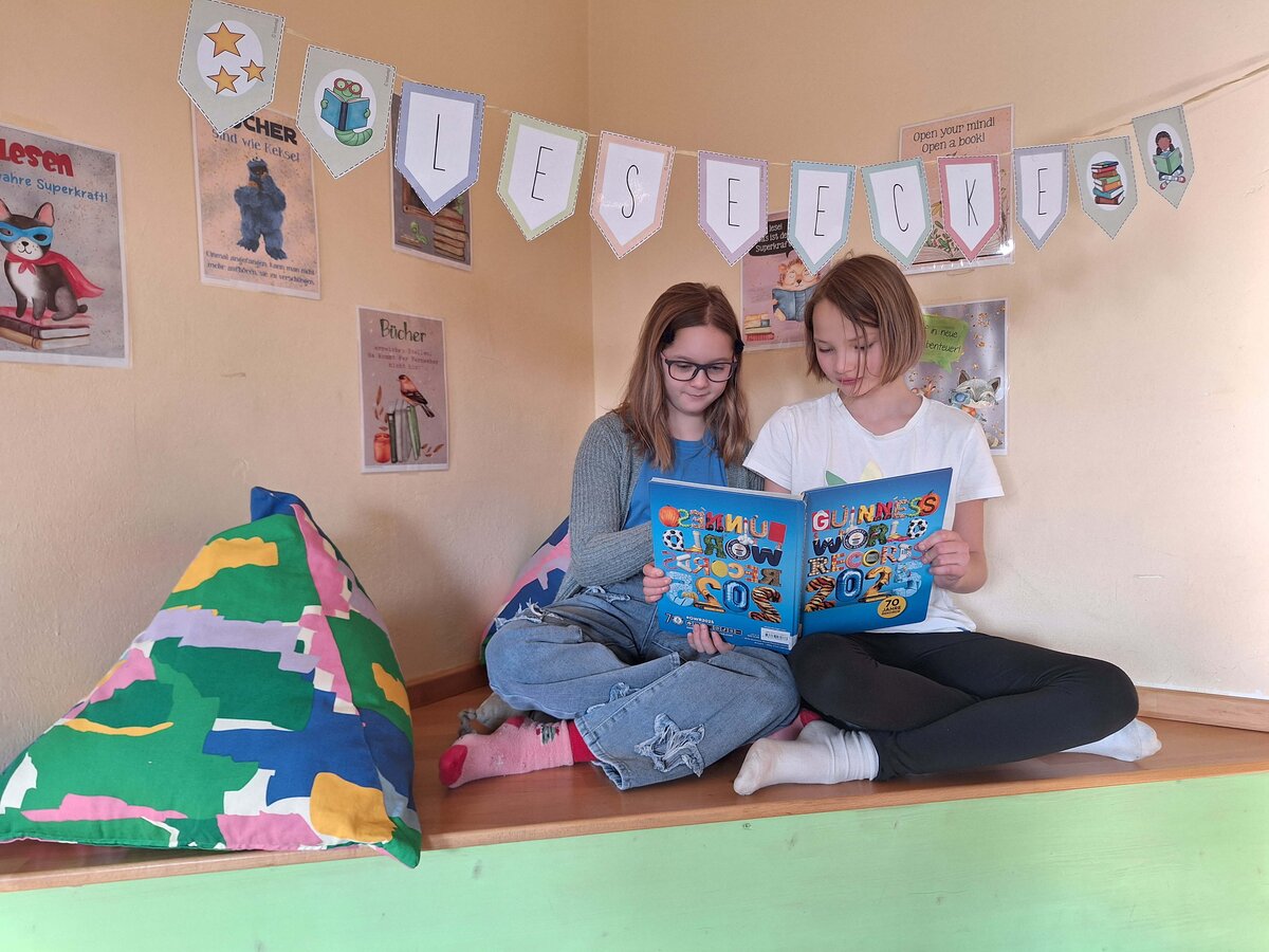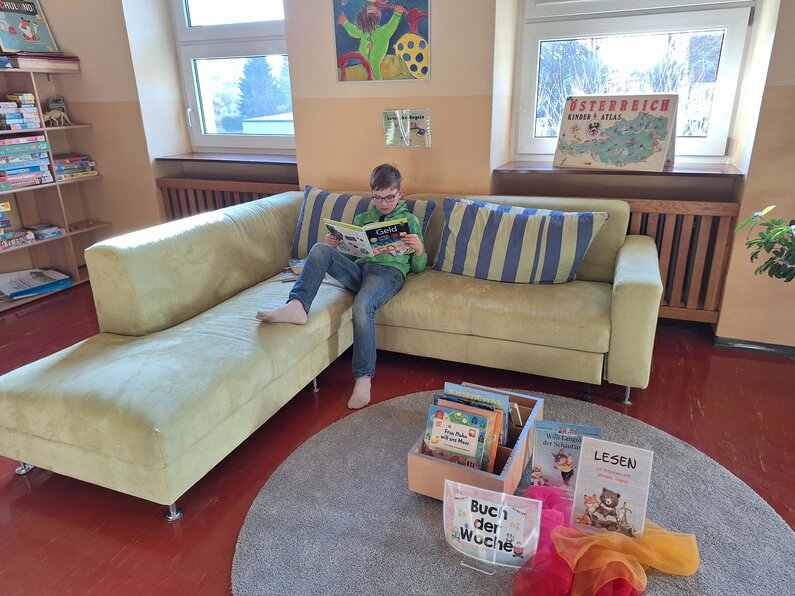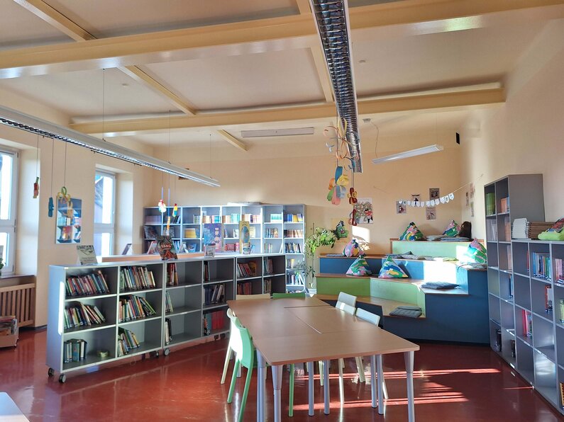 Hier kann man in andere Welten eintauchen. In einem spannenden Buch reist man vielleicht mit mutigen Heldinnen und Helden um die Welt, löst geheimnisvolle Rätsel oder erlebt fantastische Abenteuer. Sachbücher helfen dabei, Neues zu lernen und Fragen zu beantworten. Egal ob Geschichte, Natur, Technik oder Kunst – in der Bibliothek gibt es Wissen zu fast jedem Thema. Das Sortiment ist genau auf die Bedürfnisse der Volksschulkinder zugeschnitten und abgestimmt: von spannenden Bilderbüchern für die Schulanfänger über fesselnde Sachbücher für kleine und größere Entdecker bis hin zu dicken Abenteuerromanen für echte Leseprofis ist alles dabei. Die gemütlichen Leseecken mit Sitzkisssen laden dazu ein, sich mit einem Buch zurückzuziehen und einfach zu entspannen.