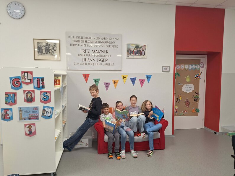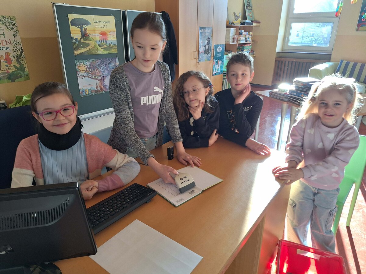 Die Bibliothek ist bei uns ein Ort der Begegnung. Wir nutzen sie für regelmäßige Vorlesestunden, gemütliche Schmökereinheiten und als Recherchezentrum für erste kleine Referate. Dabei legen wir großen Wert darauf, die Lesefreude zu fördern.